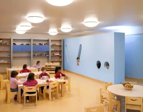 歐美國家的一些幼兒園由于在教育方式實(shí)行的是以幼兒為中心的教育手段,幼兒的活動區(qū)域具有很大的開放性,因此室內(nèi)空間多為開放性空間,同時具有更大的流通靈活性,課堂活動上有分有合,布局組合隨意。界面分隔手法奇特,半墻等半通透甚至完全通透的多種類型的隔斷,空間具有較高的層次性,界面立體性較強(qiáng),整體趣生高。