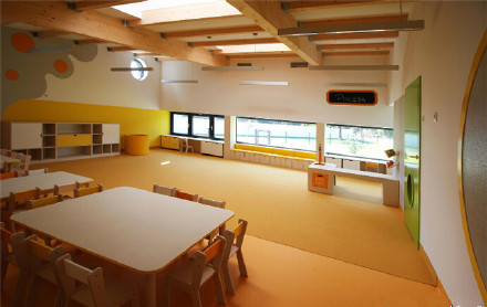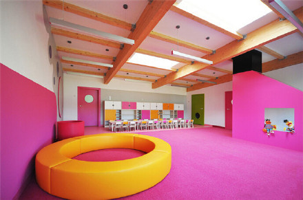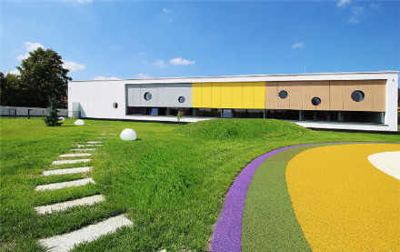Yellow Elephant幼兒園位于波蘭Ostrow Mazowiecka,單層天井式的建筑結構,屋頂采用膠合木板打造,共有5間,可招收125名兒童。內部的庭院打造沙坑、樹木及草地等,這里也是幼兒園的中心區(qū)域。面向庭院的立面安裝大型落地玻璃窗,內部既可以獲得充足的光線,也能欣賞到庭院的景色。幼兒園設計