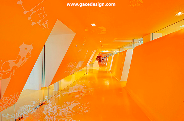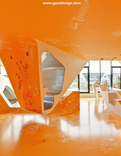 整個KU65 Kids Club的內部顏色選用來鮮亮的橙黃色與白色搭配,所有被“切開”的斷面皆為白色。桔黃色的表面上印有各種有趣的卡通圖案與涂鴉,甚至還有類似攀巖的墻壁。很難想象這里竟是一家醫(yī)療保健機構,所以項目名為KU65 Kids Club就容易理解了。幼兒園設計