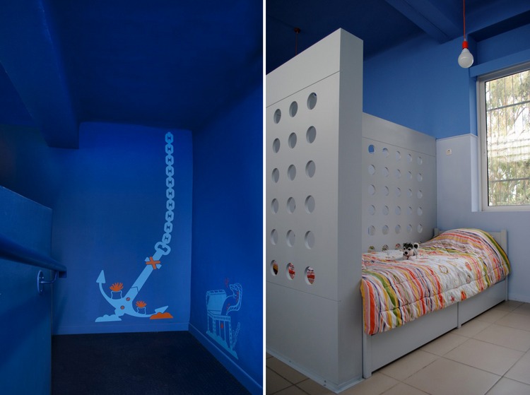 睡眠空間包含兩部分,一是隱藏空間,一是“凹處”?!半[匿處”的穿孔木制面板創(chuàng)造了獨立而且光學(xué)連續(xù)性良好的房間,而在“凹處”靠床一面的墻壁則被加厚,床深深嵌入環(huán)繞它的墻壁里,保證了在公共房間內(nèi)的隱私。