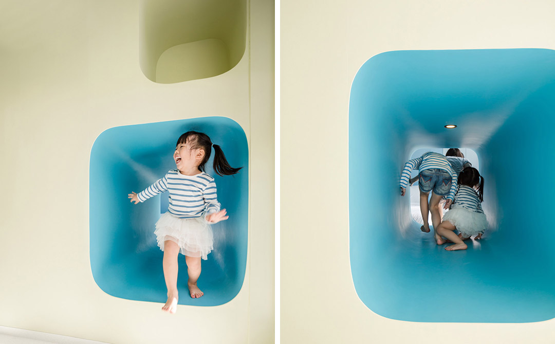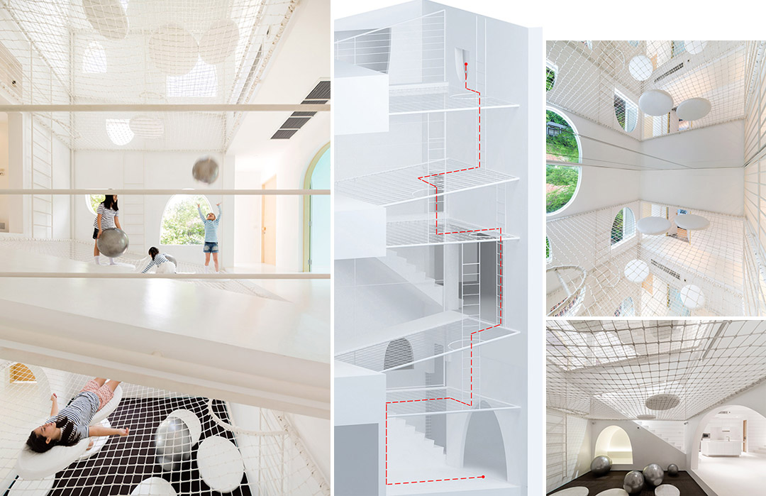 由于有下層繩網的保護,孩子們跳出床外或掉進孔洞都不會產生危險。懸吊在繩網上成為一種新玩法。抬頭看向天花板上的鏡面時,吊掛在繩網上的人似乎懸浮在空中,層疊的網層看起來比它們實際的高度更高。