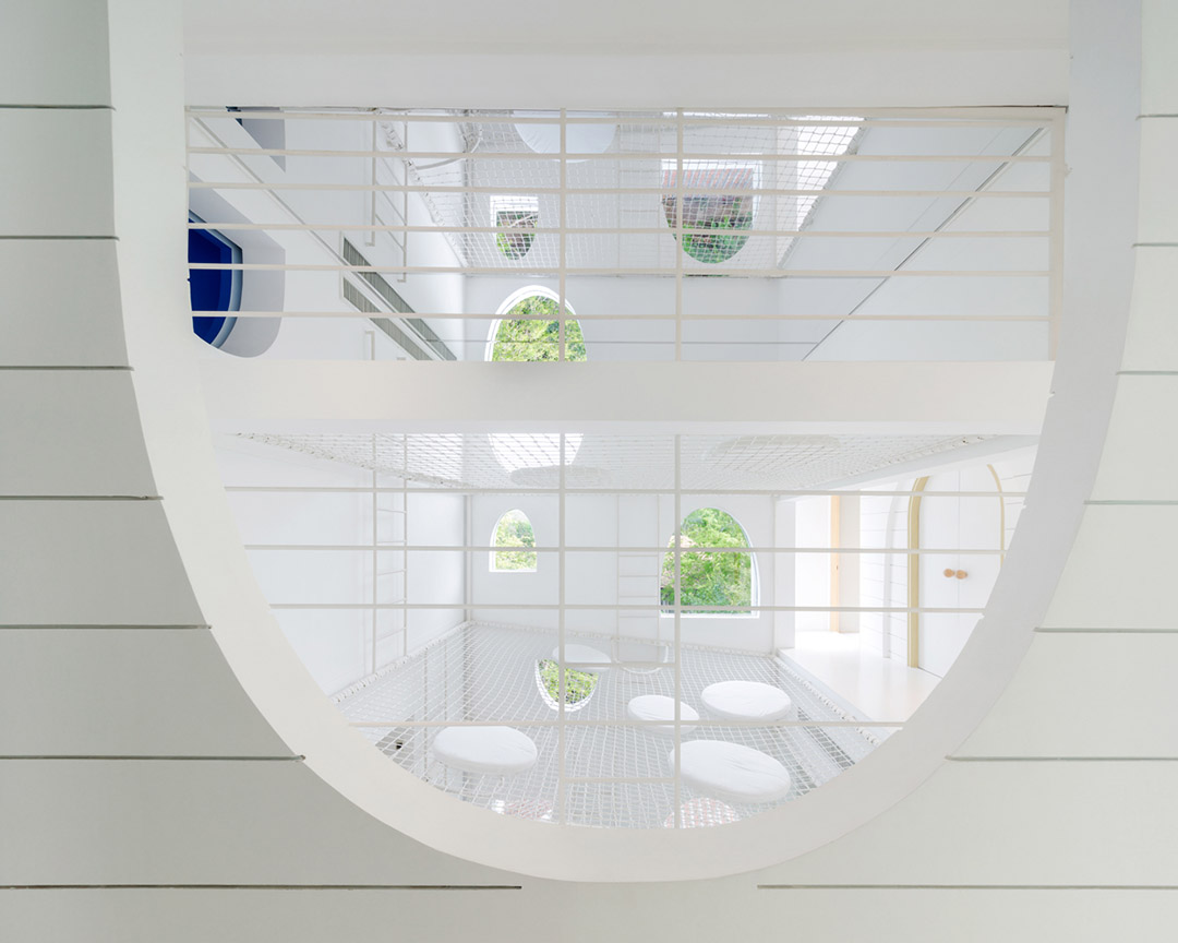 Onion用定制的繩網打造了五層不同傾斜度、高度及尺寸的水平網層。五層繩網在三層高的生活廳內充當著地板的角色,并且分別在每一層的不同位置設有一個孔洞。父母和孩子們可以通過金屬樓梯從地面層爬到三樓的一間兒童房。