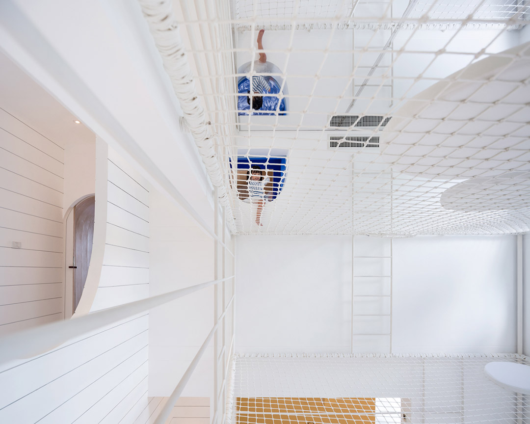 主生活廳為包括祖母在內的每一個家庭成員帶來了愉快的假期時光,這里成為Jerry House最常用和最富生氣的空間。孩子們甚至不愿意睡在臥室,而是將枕頭和被子拿到繩網上來睡覺。他們睡在相當于二層半的第四層繩網上。Jerry House讓孩子們睡在空中的夢想成為現(xiàn)實。
