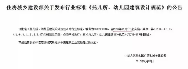 現(xiàn)批準《托兒所、幼兒園建筑設(shè)計規(guī)范》為行業(yè)標準,編號為JGJ 39-2016,自2016年11月1日起實施。其中,第3.2.8、4.1.3、4.1.9、4.1.12、6.3.3條為強制性條文,必須嚴格執(zhí)行,原《托兒所、幼兒園建筑設(shè)計規(guī)范》JGJ 39-87同時廢止。