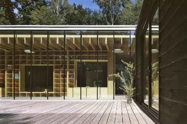 考慮到無柱玻璃立面,屋頂?shù)膽姨暨吘壊扇≈绷⒘旱男问?,無邊緣的粗鋸落葉松板形成包層。外表面帶有各種參差不齊的邊緣,與周邊自然相聯(lián)系。露臺交替布置,使建筑進(jìn)一步與周邊蔥翠的環(huán)境相融合。