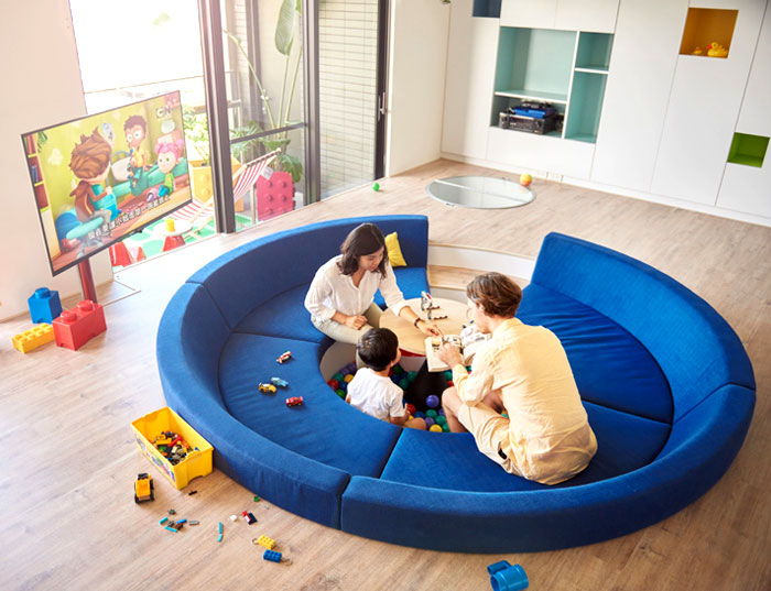 一般家庭最為重視的客廳區(qū)域卻被 HAO Design 改成了家庭活動(dòng)區(qū),下沉式的藍(lán)色圓形沙發(fā)讓空隙處變成了一個(gè)游戲池,倒入海洋球,一家人的溝通從此處開始,可旋轉(zhuǎn)的電視讓任一角落都能觀看。整面的儲(chǔ)物柜讓雜物隱于無(wú)形,干凈整潔的空間更適合孩子的玩耍。(幼兒園設(shè)計(jì))
