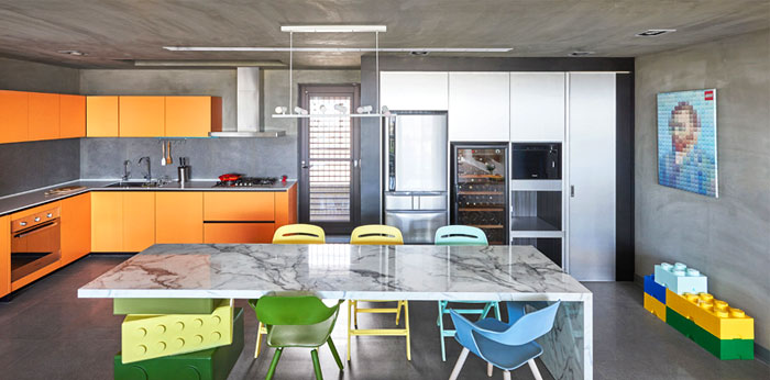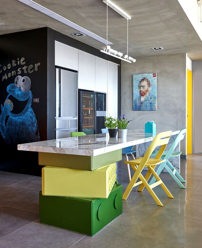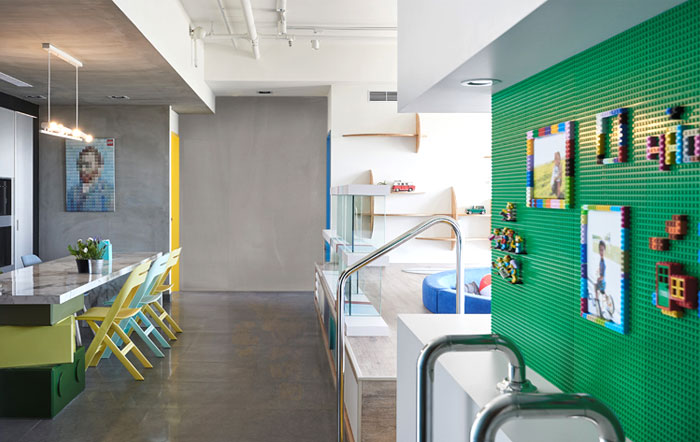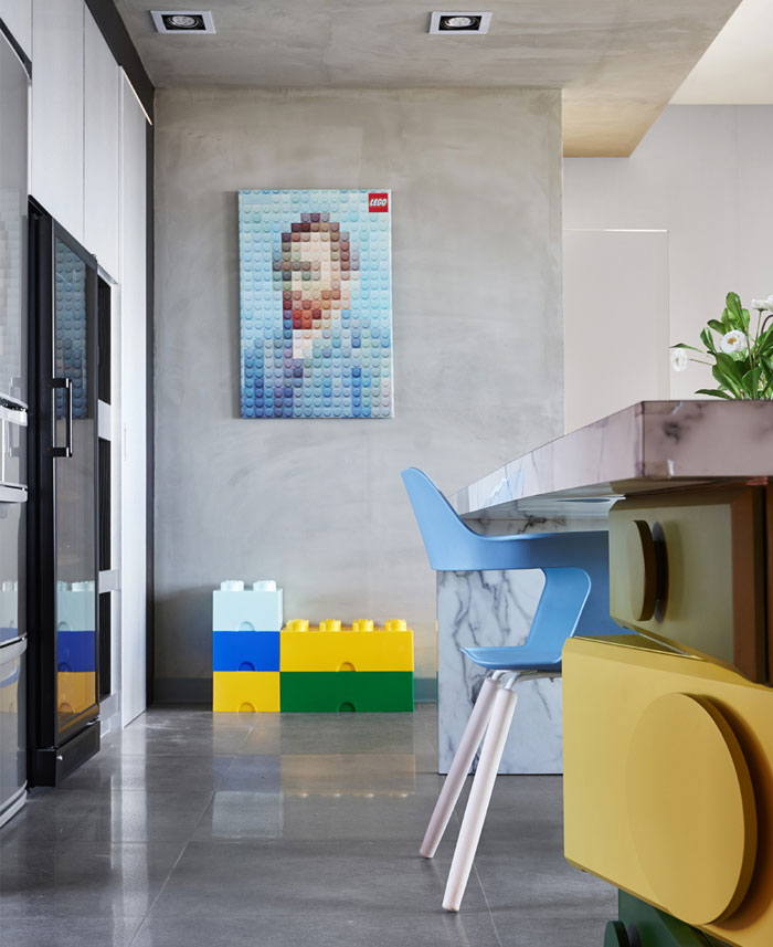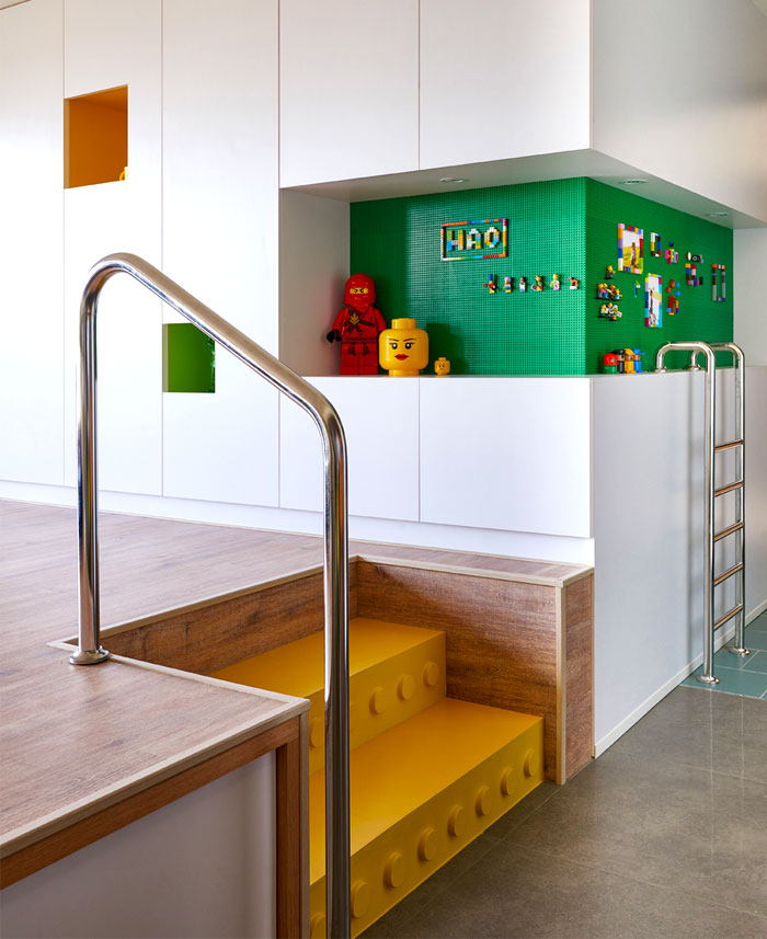 在任一角落似乎都能捕捉到樂高元素,臺(tái)階,展示柜,餐桌甚至是墻上的掛畫都被打上了標(biāo)簽,不同色彩的積木條不僅增添趣味性還讓整個(gè)空間變得豐富起來(lái)。