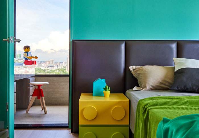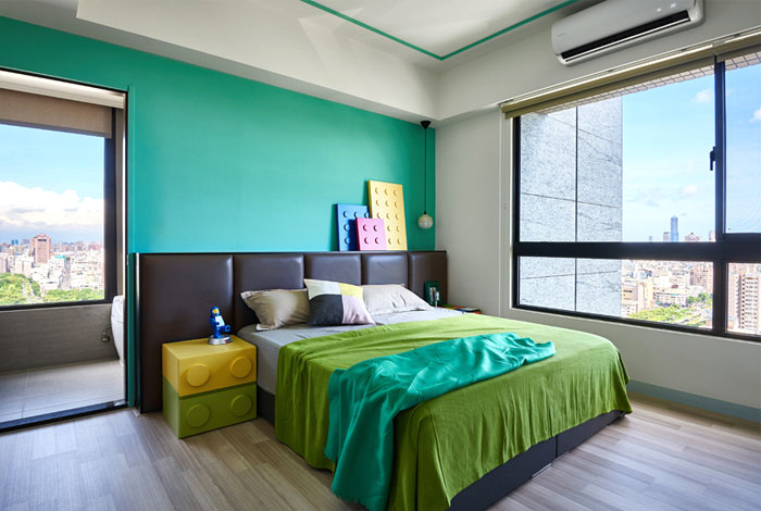 藍(lán)色,綠色,黃色,臥室的色彩十分的跳躍,必不可少的樂高元素讓臥室起來(lái)就像是玩具中的空間,利用大窗戶帶來(lái)的良好采光,降低鮮艷色彩帶來(lái)的視覺疲勞,這樣一個(gè)充滿童趣的空間也拉近了父母與孩子的距離。