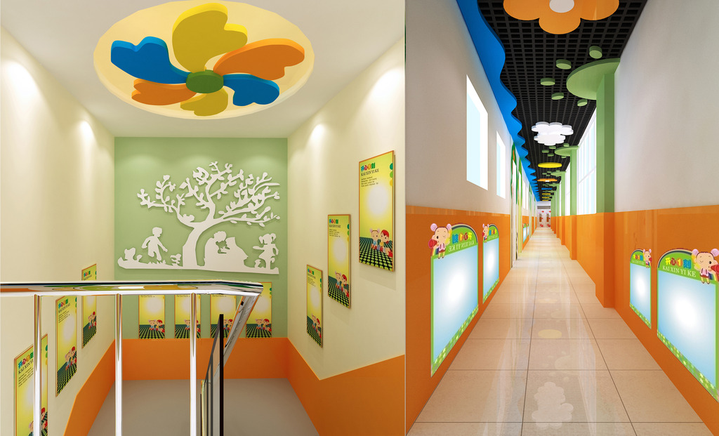 幼兒園裝修走廊要貫通一氣,盡量保證走廊的寬度在1.2米以上。邊上的圍欄最好是密封型的,高度不能低于1米。樓梯護欄在體現(xiàn)建筑特點上有一定的作用,因而在造型上要獨特,有幼兒園特點??纱蚱苽鹘y(tǒng)的平直封閉形式,有凹凸變化,可按現(xiàn)代的平面來構(gòu)成,增加圍欄的趣味性,也可以設(shè)計成上部分通透、下部分封閉的形式,但要防止幼兒攀爬兩邊墻面。