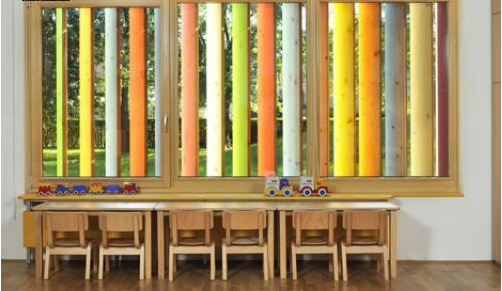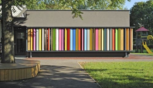 由于周圍社區(qū)兒童數(shù)量的不斷增加,Kekec幼兒園決定擴建一間游戲室,由JureKotnik建筑公司進(jìn)行設(shè)計??紤]到這是一個為兒童服務(wù)的建筑,因此最重要的設(shè)計元素就是色彩,除此之外,設(shè)計師還希望新建筑的樣式更加靈活,融入一些玩具的特點,讓孩子們能夠與之互動,從而增添一些娛樂性。而實現(xiàn)以上幾點只需要一個機關(guān)——像百葉窗一樣會“轉(zhuǎn)”的墻壁。