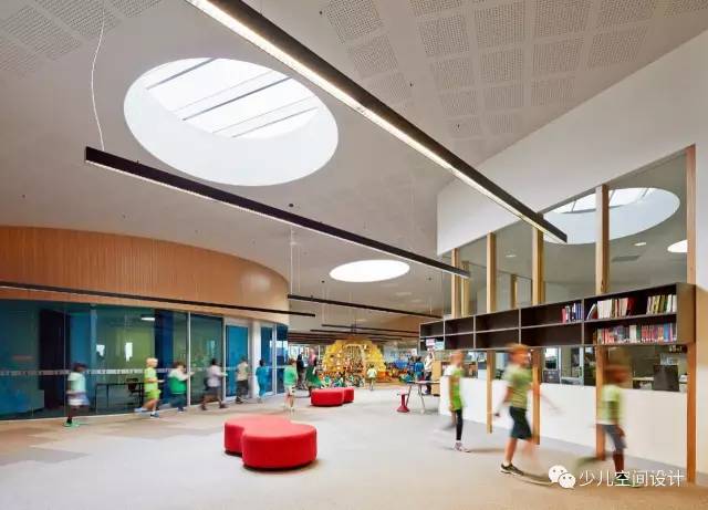 由于材質(zhì)面板呼應(yīng)色彩鮮亮的學(xué)生作品和家具,學(xué)校顯得熱情好客和溫暖;深色調(diào)與寬闊的玻璃相結(jié)合,增強了設(shè)施的透明度。大量插件板用于墻壁、地板和天花板,在廣泛的聲學(xué)處理中發(fā)揮關(guān)鍵作用,這是混合學(xué)習(xí)空間里必不可少的。(幼兒園設(shè)計)