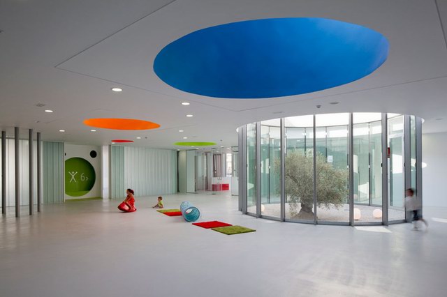 看到這個幼兒園就會讓人想起Lewis Carroll的那本著名童話故事《愛麗絲奇境漫游記》。同樣是把我們帶入一個多種感受的世界,其中融合了幻想與真實、工作與玩耍、樂趣與責(zé)任。孩子們眼中的空間,有著與成人相異的感覺、體驗、尺度以及色彩,如果要與成人共處,就很有必要使用雙重尺度,讓每個人都能適應(yīng)環(huán)境。然而,要適應(yīng)的不僅有尺度,還有空間的感知特性。因此,我們從建筑的內(nèi)部開始最基本的思考。