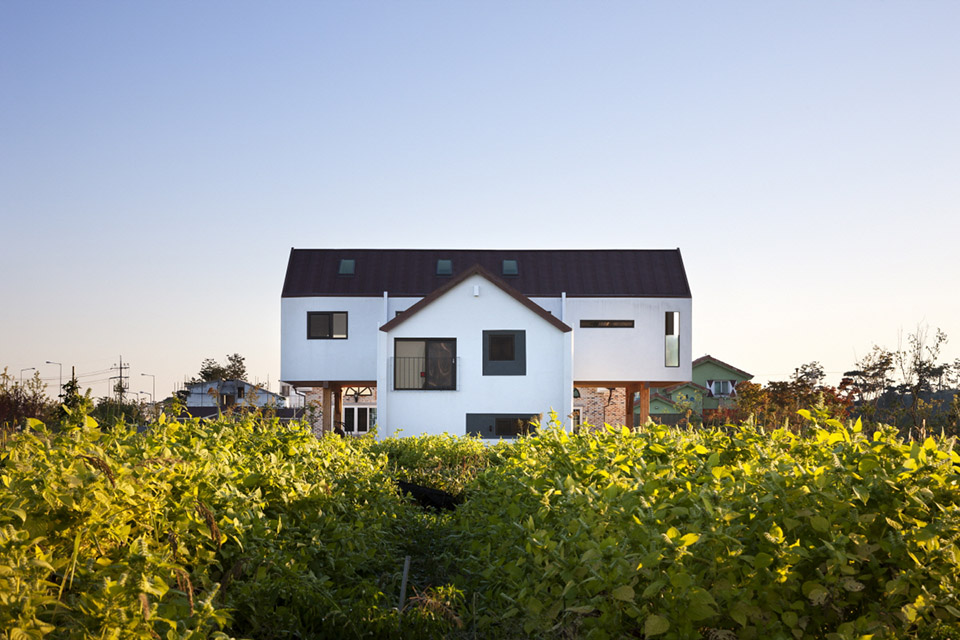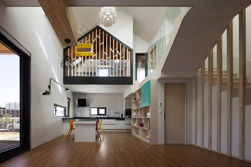 在韓國的益山州市有一棟英文字母“T”型的房子,這棟房子是采用30里面后的膠合木建筑的全木質(zhì)住宅,在T字的兩個端頭被挑起,分別的形成了入口門廊和客廳的花園休閑平臺,一層為開放的大空間,包含了起居室,廚房和餐廳,第二場則是私人空間,設(shè)有書房,游戲廳和臥室等房間。