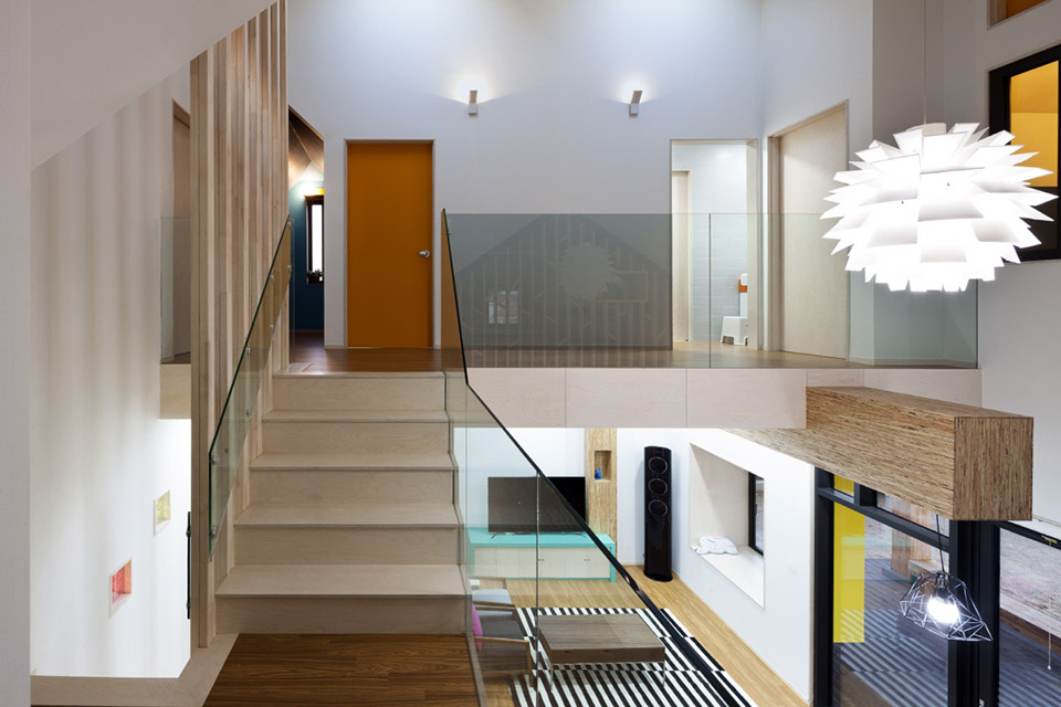 衛(wèi)生間,臥室和兒童房,還有工作室都設(shè)在了二樓。工作室面對院子,這樣可以讓家長在一邊工作室之余也能注意到在外玩耍的孩子。整個房屋以孩子為核心進行設(shè)計,創(chuàng)造出有趣關(guān)聯(lián)還有互動的室內(nèi)外空間