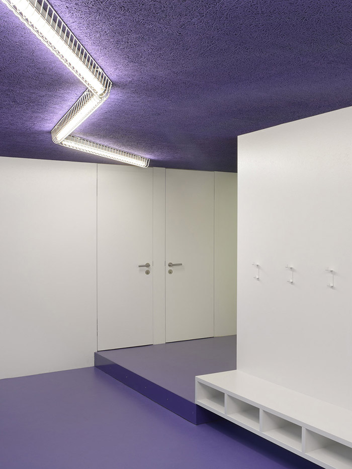幼兒園的室內(nèi)也有著各個(gè)房間的用途,入口一進(jìn)去就是衣帽間,然后到教室-資料室-游戲區(qū)域和多功能房間。這些依次布局的房間升起于一小段臺(tái)階之上。沿著臺(tái)階可以一直到達(dá)頂層的辦公室。辦公室體量同時(shí)覆蓋了位于其下方的入口。繼續(xù)沿著臺(tái)階往下可以返回入口,這樣完成了整個(gè)循環(huán)路線。