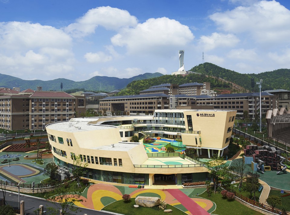 在浙江一所名為海亮國際的幼兒園是一座大型的寄宿制度的幼兒園,其中面積達到10000平方米,園內(nèi)共分為25個班,能容納五百多名兒童,對孩子們活動安全方面考慮,幼兒園在園內(nèi)選擇了一個先對平緩的一塊平地,周邊則是分別為初中、小學(xué)、體育場館、接待中心等,較為復(fù)雜和擁擠。在一個這樣復(fù)雜的環(huán)境下如何去給孩子們?nèi)?chuàng)造一個具有安全感,符合孩子們心理的歡樂場所,這成為了設(shè)計師的主要挑戰(zhàn)。