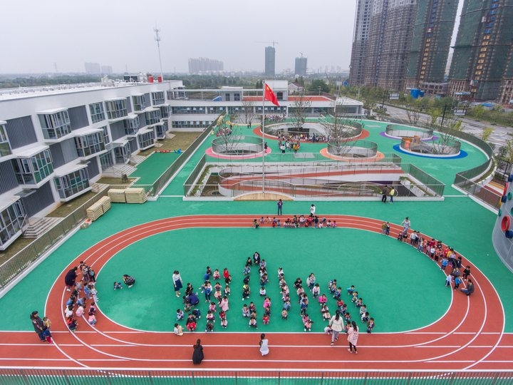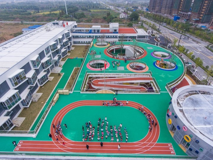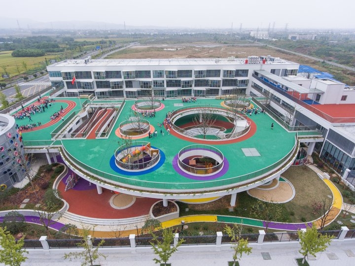 在浙江湖州長(zhǎng)興縣龍山街道的中心幼兒園,在十月十七日正式開園,這是一個(gè)投資八千萬元占地十九畝的幼兒園,據(jù)了解這個(gè)幼兒園的設(shè)計(jì)理念是來源于日本,在日本富士有個(gè)幼兒園和空山中心幼兒園一樣都是在郊外建設(shè)的,因?yàn)橥恋赜邢薜菍W(xué)生們還是需要一個(gè)可以給學(xué)生運(yùn)動(dòng)的的操場(chǎng),為了解決這個(gè)場(chǎng)地不足的問題所以設(shè)計(jì)師還講操場(chǎng)跑到設(shè)計(jì)到了屋頂,做成了一個(gè)環(huán)形結(jié)構(gòu),之所以要這樣設(shè)計(jì)是因?yàn)楹⒆拥倪\(yùn)動(dòng)規(guī)律是特別喜歡跑圈。