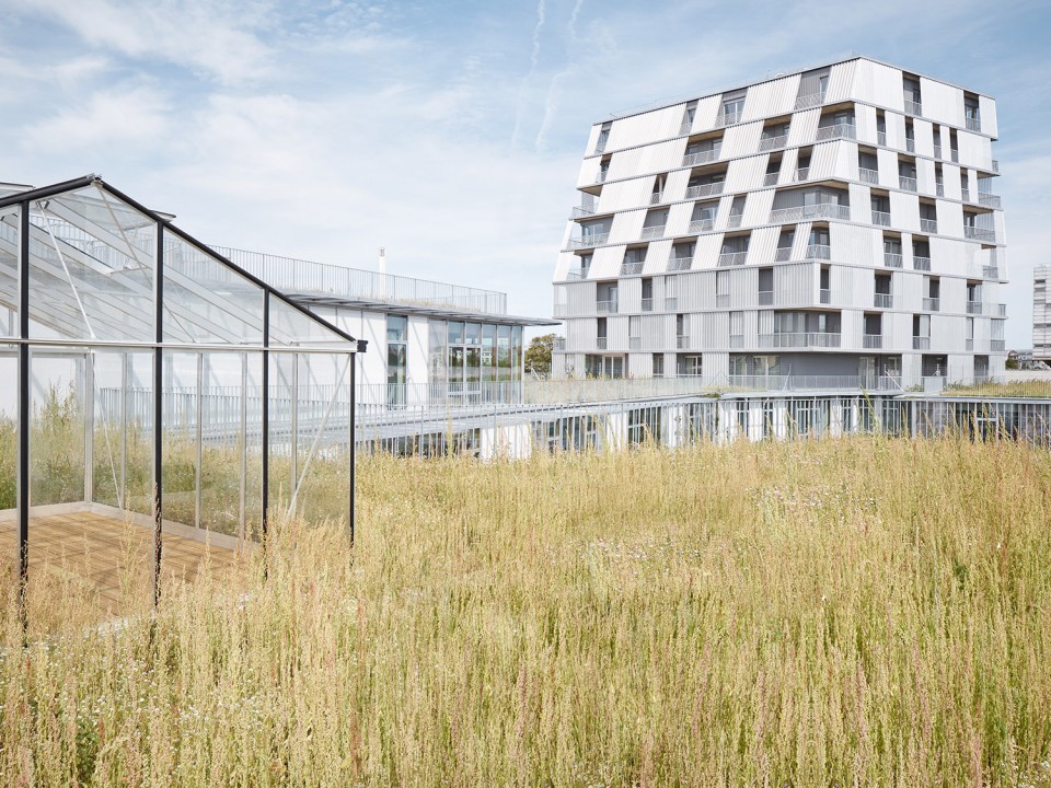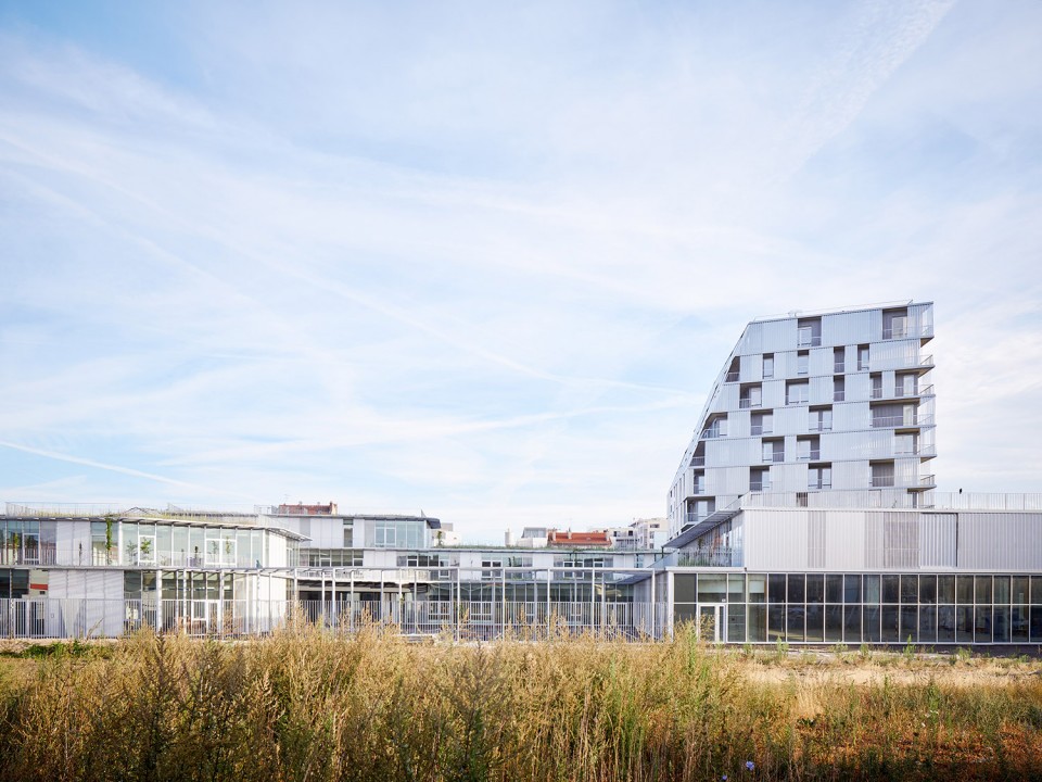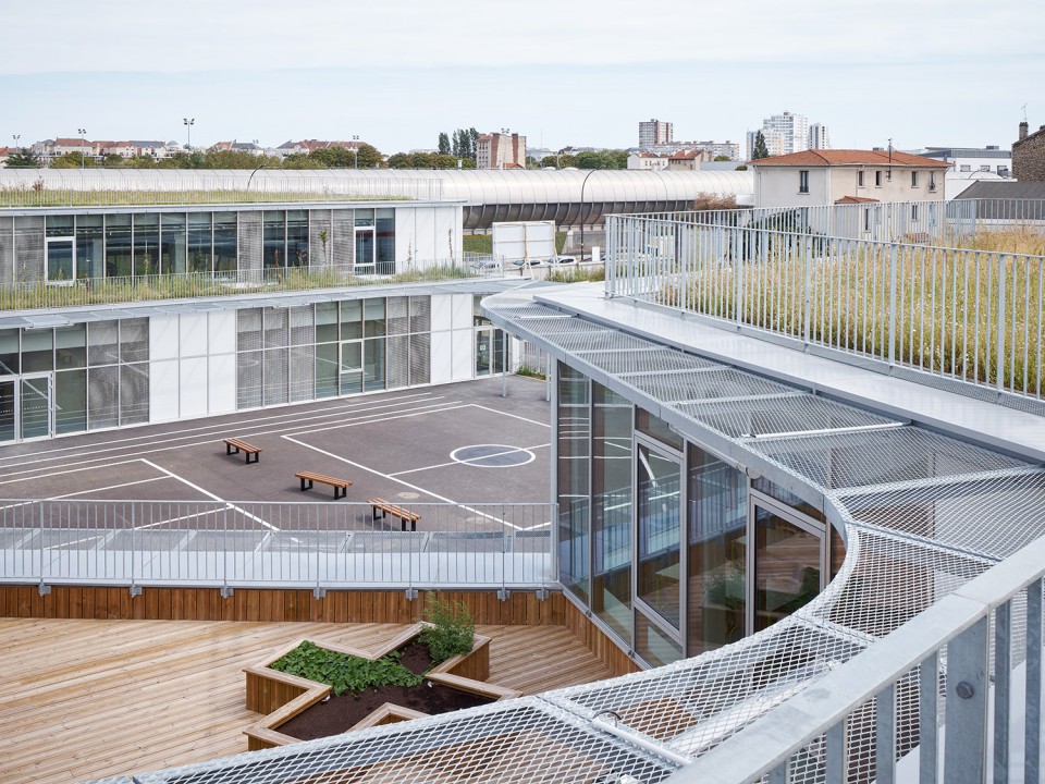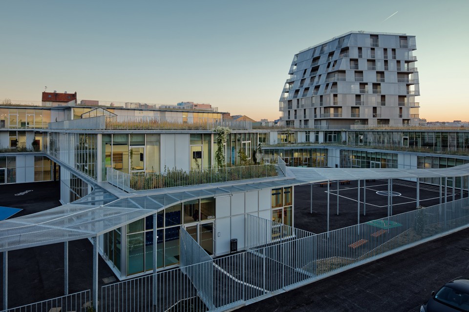 學(xué)生宿舍的設(shè)計(jì)基于4個(gè)主要建筑學(xué)原則。首先,項(xiàng)目作為一個(gè)整體要具有合理的功能(結(jié)構(gòu)和技術(shù)空間的疊加),同時(shí)還要緊湊。距離其他功能分區(qū)的距離使它有所脫節(jié),具有一定的獨(dú)立性。由于宿舍區(qū)被設(shè)置在盡可能北的方位,最窄的立面朝向Jean-Jaurès大街,平臺不會阻擋陽光進(jìn)入室內(nèi)。這也保證了操場能夠享受足夠多的陽光。