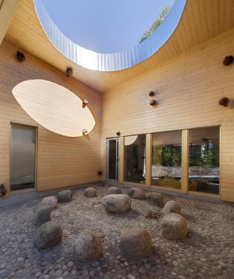 整個(gè)建筑鋪砌一新的內(nèi)部庭院朝向門廳開放,會(huì)內(nèi)的天花板上有一個(gè)巨大的露天圓形開口,隨著時(shí)間的推移使得移動(dòng)的陽光成為了室內(nèi)庭院中一道亮麗的風(fēng)景,庭院內(nèi)還有這藝術(shù)家創(chuàng)作由20個(gè)落葉松木制作的球體組成,代表著宇宙的雕像。(幼兒園室內(nèi)設(shè)計(jì))