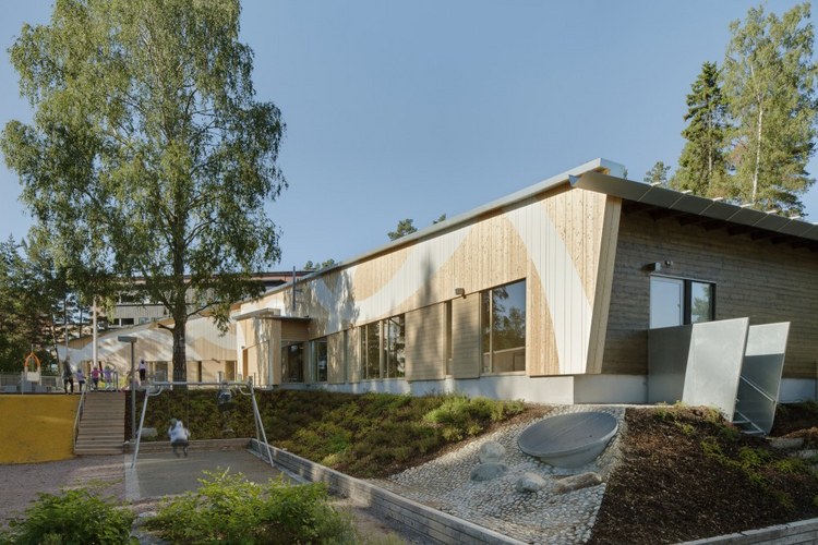 Omenapuisto日托中心位于芬蘭赫爾辛基,整個(gè)建筑主要的由單層體量構(gòu)成,兩層高的部分是一個(gè)多功能的高挑空間,并且在這個(gè)空間設(shè)計(jì)有著一個(gè)通風(fēng)裝置室和陽臺(tái),整個(gè)建筑所在場(chǎng)地非常狹窄,項(xiàng)目的目標(biāo)是打造輕盈開放的體量,屋頂吵兩個(gè)方向緩緩傾斜每一端都有一個(gè)大水槽將雨水排放到石頭鋪砌的水池中,并由此滲入地面,場(chǎng)地內(nèi)水平高度的自然差異被用作坡道,與相鄰的道路形態(tài)相呼應(yīng)。(幼兒園設(shè)計(jì))