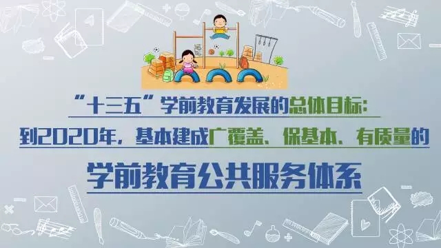 《意見》對(duì)“十三五”學(xué)前教育改革發(fā)展做出了全面部署,提出了“十三五”學(xué)前教育發(fā)展的總體目標(biāo):到2020年,基本建成廣覆蓋、?;尽⒂匈|(zhì)量的學(xué)前教育公共服務(wù)體系。