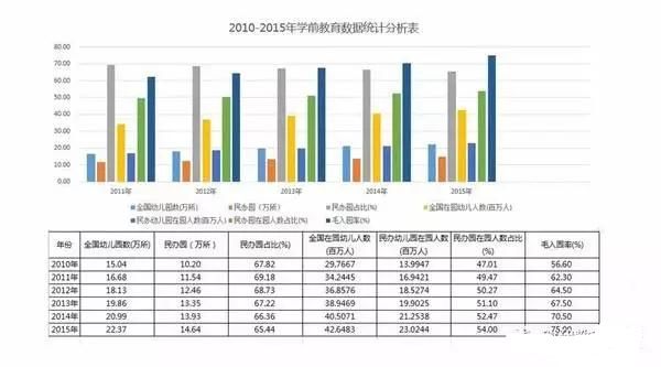 從數(shù)據(jù)得出,民辦幼兒園數(shù)量平均每年增長0.86萬所,2015年較2014年增長0.71萬所,假設“0.71萬所”的增速持續(xù),2020年中國民辦幼兒園有望達到18.19萬所。民辦幼兒園在園人數(shù)占比達54%,并且該比例持續(xù)以每年1到2個百分點的速度增長。