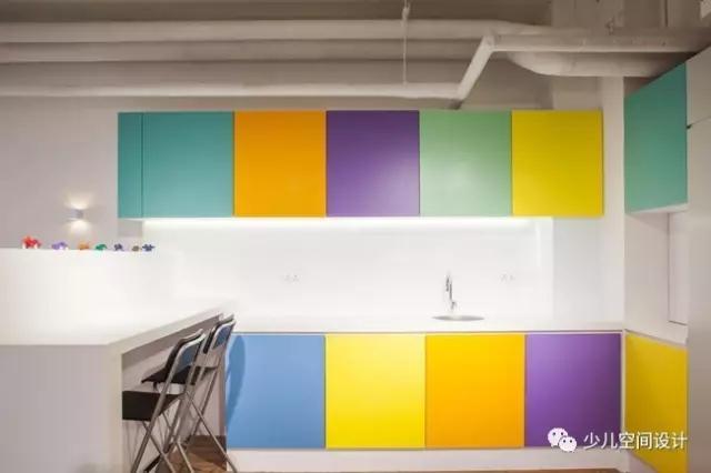 就餐區(qū)和休息區(qū)是專門為家長和老師設(shè)計(jì)的兩個(gè)區(qū)域,他們可以在這里交流溝通孩子的情況。就餐區(qū)在功能上是一個(gè)帶有多重色彩櫥柜的敞開式廚房,它這樣的設(shè)計(jì)還可以激發(fā)孩子的興趣以及異想天開的想象力。就餐區(qū)的顏色都源自Babysteps的標(biāo)識中相同的色調(diào),與幼兒樂園整體的設(shè)計(jì)在視覺上形成統(tǒng)一,同時(shí)它也與整個(gè)室內(nèi)空間微妙的單色調(diào)相互協(xié)調(diào)。