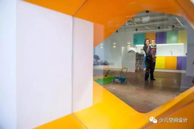 探索和運(yùn)動(dòng)區(qū)是幼兒樂園的重點(diǎn)區(qū)域。幼兒園室內(nèi)設(shè)計(jì) 在這個(gè)開放式的,明亮而怡人的活動(dòng)區(qū),可以容納多種運(yùn)動(dòng)方式:純粹運(yùn)動(dòng)的方式、感知觸覺的方式、還有安靜的方式。一面帶有幾何圖案的彩色墻壁極具特色,這堵墻圍成了一個(gè)儲存區(qū)角,并且自然而然地將活動(dòng)區(qū)內(nèi)不同方式的運(yùn)動(dòng)區(qū)分割開來。進(jìn)一步來說,這種分割還可以讓孩子和家長通過墻上幾何圖案的窗框看到教室里面的情景。