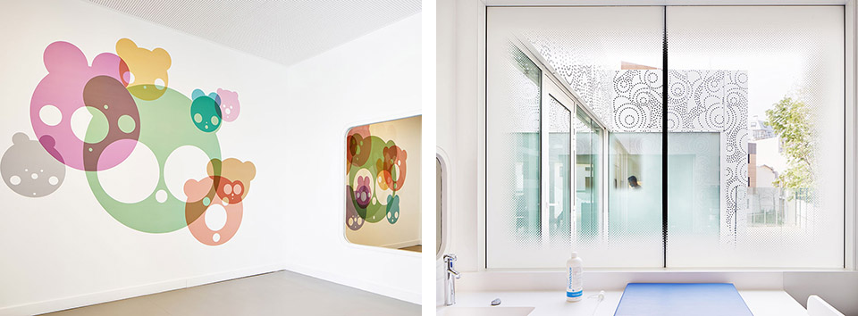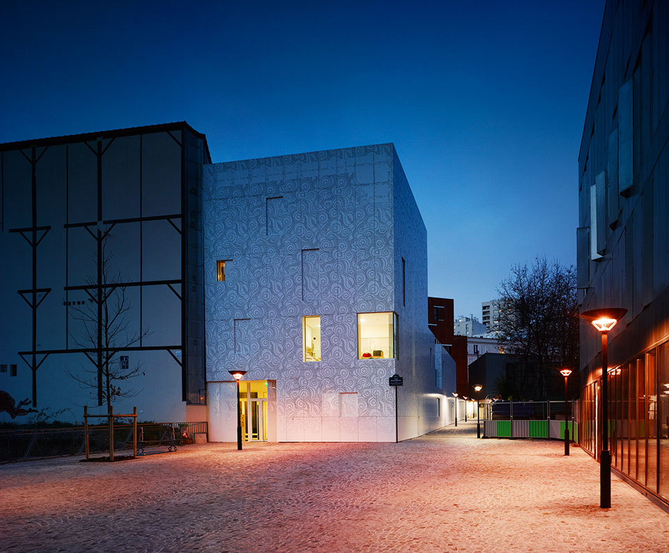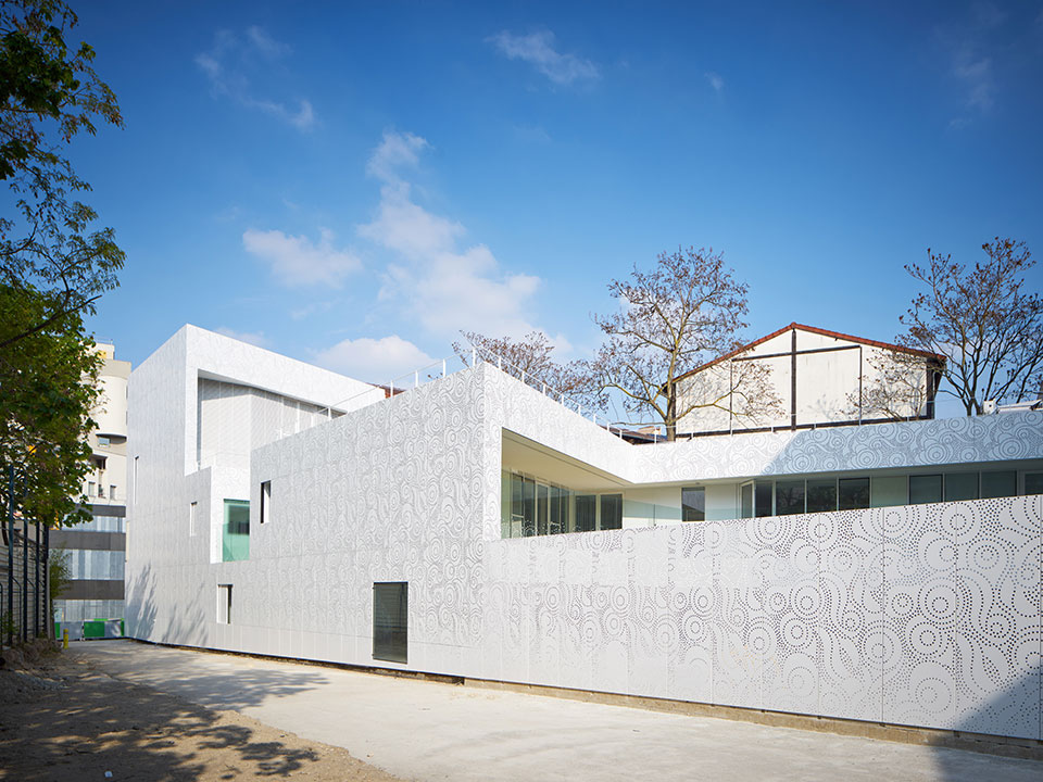 法國(guó)建筑事務(wù)所Avenier Cornejo設(shè)計(jì)的巴黎20區(qū)幼兒園建成,這所可容納66個(gè)孩子的幼兒園是一座獨(dú)特的建筑,為兒童提供安心的環(huán)境。建筑以混凝土為結(jié)構(gòu),滿滿占據(jù)著三角形地塊,并沿兩側(cè)邊緣開(kāi)了三個(gè)內(nèi)庭院,為建筑提供充足的陽(yáng)光與光線。建筑周身覆蓋有著美麗花樣的金屬穿孔板。這層金屬外表皮還覆蓋了部分窗戶,為其提供過(guò)濾的光,并在夜晚像燈籠一樣透光。傍晚來(lái)臨的時(shí)候,兩旁的路燈亮出詳和的燈光,好像都在刻意討好這所幼兒園。它就像一位非常漂亮文雅的姑娘,周圍建筑和路燈都是敗在它的石榴裙下的紳士! 此幼兒園的顏色和圖紋,與周圍建筑想必是那么與眾不同,一下子就能夠把人們的目光吸引住了。
