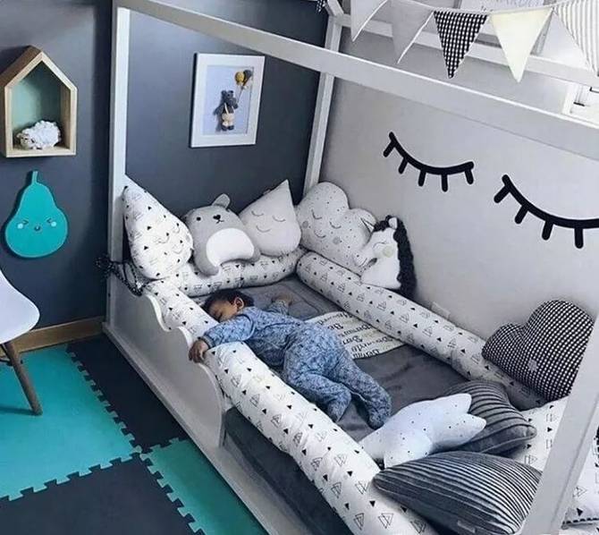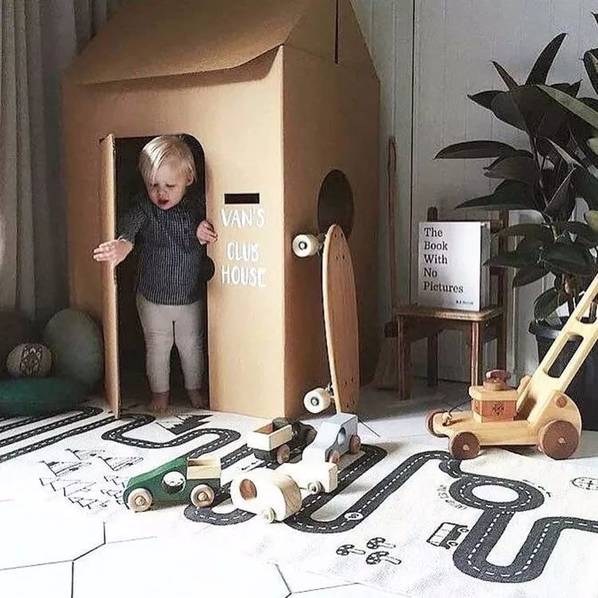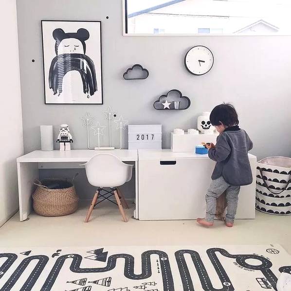 房間里還可以設(shè)置一些簡(jiǎn)易的玩樂設(shè)施。1-3歲的孩子需要父母的時(shí)刻陪伴,我們可以在房間或者客廳放上爬行墊+安全圍欄給孩子一個(gè)小區(qū)域領(lǐng)地,把這里變成一個(gè)親子小游戲區(qū)。在兒童房里也可以在地面貼上玩具貼紙,把局部地面變成孩子的游戲地圖,適合在游戲中培養(yǎng)孩子創(chuàng)造力和分享的意識(shí),留出空間,讓孩子可以和朋友或者和父母一起玩玩具,孩子1歲之后我們可以適當(dāng)添置一些矮柜來(lái)收納玩具,還可以讓孩子扶著學(xué)走路。在兒童床上加一個(gè)木架結(jié)構(gòu),把床做成木房子,給孩子一個(gè)開放的獨(dú)立空間。這種具象的區(qū)域不僅會(huì)給孩子安全感,還能滿足他們的探險(xiǎn)欲,
