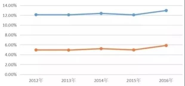 上述圖表是2012年-2016年中國人口出生率和自然增長率概況。出生率在2014年曾出現(xiàn)小幅上漲達(dá)到12.37‰,2016年漲幅較大達(dá)到12.95‰,其余時(shí)間無明顯變化,均維持在約為12‰的水平。