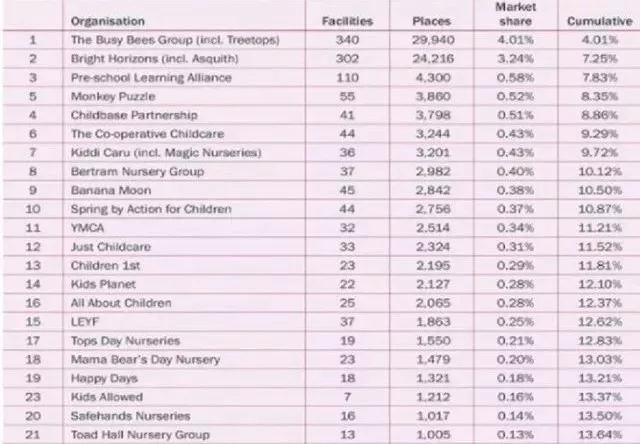 再來講一講,英國早教市場的育化。下圖是2018年英國早教市場前21名:(英國義務(wù)教育從4歲開始,0-4歲的保育階段已經(jīng)高度市場化)