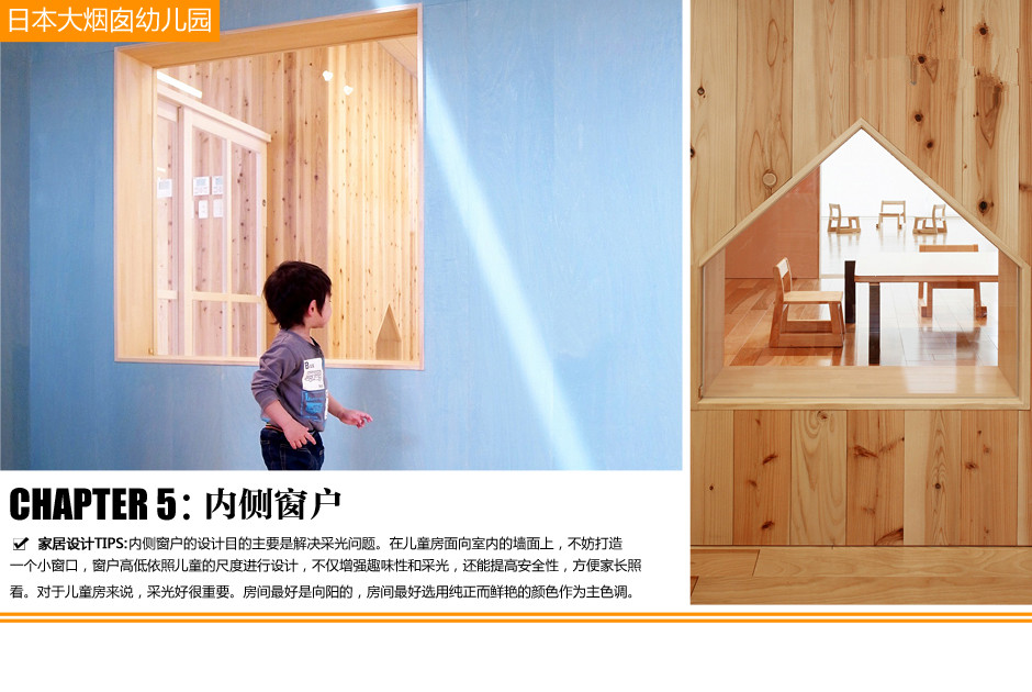 5、這間木制幼兒園的內(nèi)部有各種形狀的門窗,連通各個空間。孩子們能感覺到從天花、門窗進入的自然光線的變化,甚至可以追逐他們并一同玩耍,讓孩子在日常生活以及活動中享受光的禮物。合適且充足的照明,能讓房間溫暖、有安全感,有助于消除孩子獨處時的恐懼感。