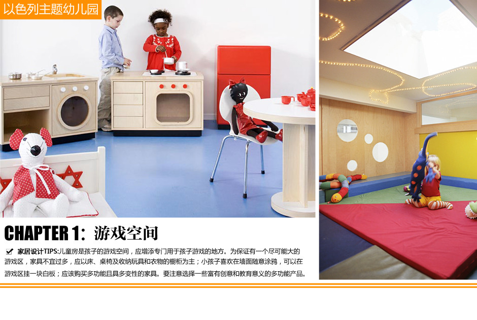 之所以把幼兒園設(shè)計和兒童房的設(shè)計聯(lián)系起來,首要一點就是它們的使用者都是3-6歲的兒童,因此這兩個空間的設(shè)計其實是相通的。幼兒園大致分為兩類:一是偏重于室外環(huán)境,另一類偏重于室內(nèi)的幼兒園,設(shè)計上偏向家居的設(shè)計特點。
